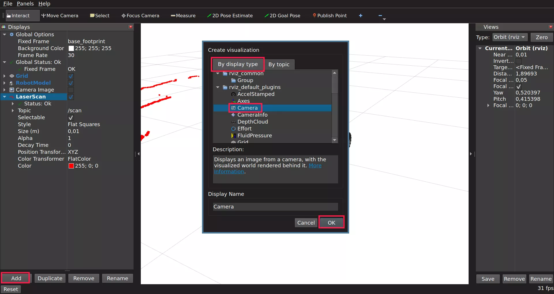 topic. Choose the LaserScan display and click Ok.